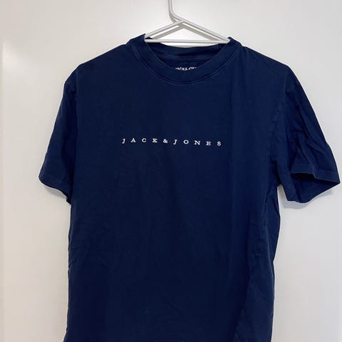 Jack & Jones t-skjorte for herre i størrelse M. T-skjorten er svart med trykkmotiv på fronten. Kort erm og rund hals. Passer til hverdagsbruk alene eller under genser eller jakke.
