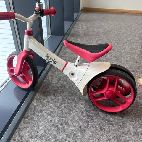 Super og veldig stødig balansesykkel selges. Y Velo har dobbelt bakhjul, der det ene kan taes av når barnet mestrer sykkelen bedre. Reguleringsmuligheter på sete og styre. Vekt opp til 20 kg.