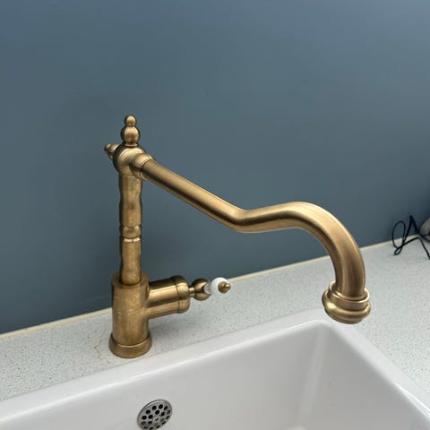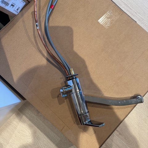 Pakken inneholder et kjøkkenarmatur av typen ettgreps blandebatteri med buet tut, samt tilhørende monteringsdeler som vist på bildene. I tillegg følger det med to ekstra kjøkkenbatterier: ett i messingfarget utførelse med to vridere og buet tut, og ett ettgreps blandebatteri i krom med buet tut og monteringsdeler.