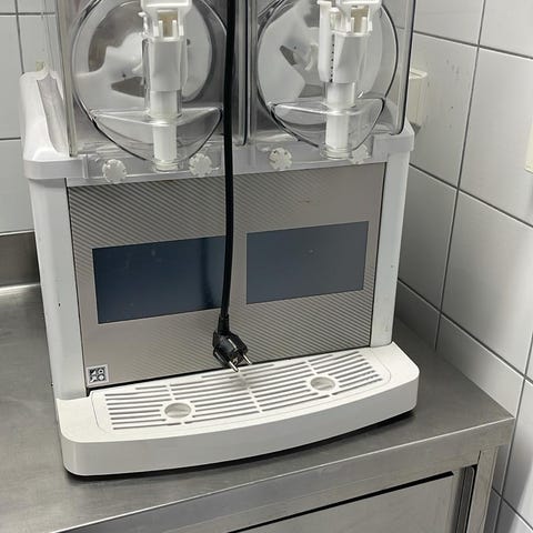 Ny pris ca 35 000,- Elmeco slushmaskin med flere beholdere. Maskinen har transparent beholder med integrert røresystem og sort topp og tappekran. Understell og front er i rustfritt stål med dryppbrett under tappene. Maskinen har elektronisk betjeningspanel med display og knapper for innstillinger. Egnet for tilberedning og servering av slush og frosne drikker i kiosk, kafé eller lignende serveringsmiljøer. Virker som den skal.
