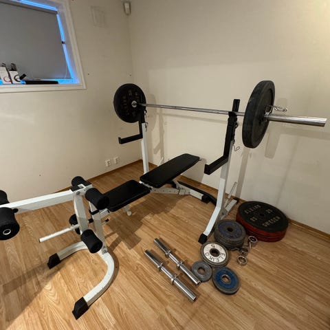 Har også ca 10 m2 med veldig godt treningsgulv. 2cm tjukt. Samme som brukes på treningssenter. Disse står litt knotete til, så ta kontakt hvis interessen er der👍 er ikke med i prisen.