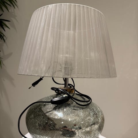 Stål fot og sølv skjermer med avtagbare krystaller. 4 pærer pr lampe Max 25 watt pr stk.