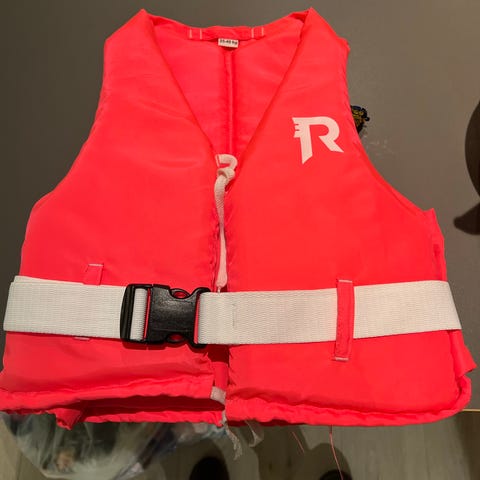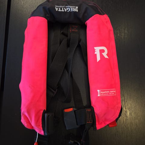 Regatta redningsvest i rosa farge. Vesten har belte med spenne foran og knytesnor øverst for justering. Den er merket med CE-godkjenning på innsiden og har påsydd informasjonslapp med tekniske data og brukerinstruksjoner. Egnet som flyteutstyr ved bruk i båt og andre aktiviteter på vannet.
