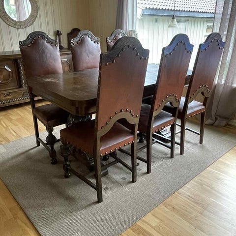 4 stoler følger med. Stolene er trukket om, og man kan se litt av orginaltrekket på den ene stolen (se vedlagt bilde).