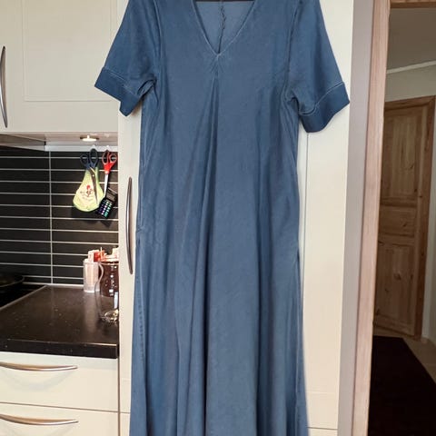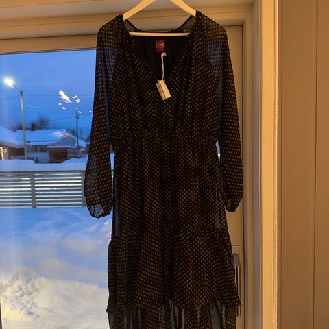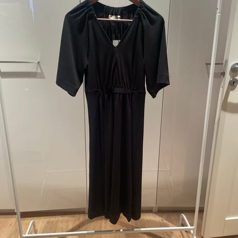 Line of Oslo kjole for dame i størrelse L. Kjolen er svart og laget i 100 % viskose, med fôr også i viskose. Modellen har lange ermer og knappelukking bak i nakken med liten åpning. Passer som en enkel hverdagskjole i lett og mykt materiale.