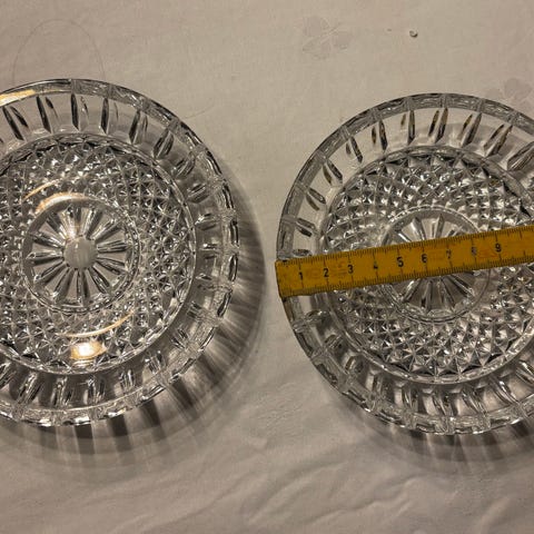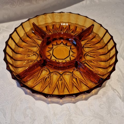 6 Fine fruktfat evt dessertskåler da de har en svak fordypning og derfor egnet til dette. Det ene fatet har fått et lite hakk i kanten, som det fremkommer på bildet. Ellers er disse Ravfargede fatene i fin stand og med et veldig fint mønster.