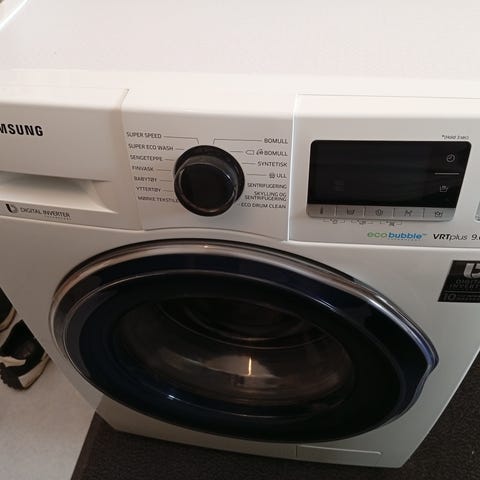 Hvit frontmatet vaskemaskin fra Samsung. Maskinen har stor dør og tar 9kg.