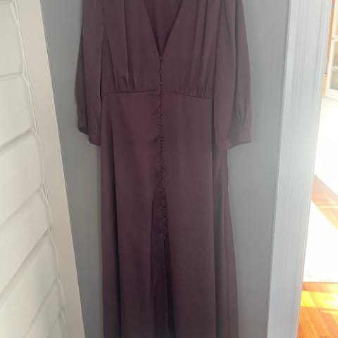 Nydelig finkjole fra Riccovero selges da den ikke blir brukt. Str. 42, støvet rosa farge. Lekkert sateng stoff som faller fint. Kledelig snitt. Kjolen er kun brukt en gang.