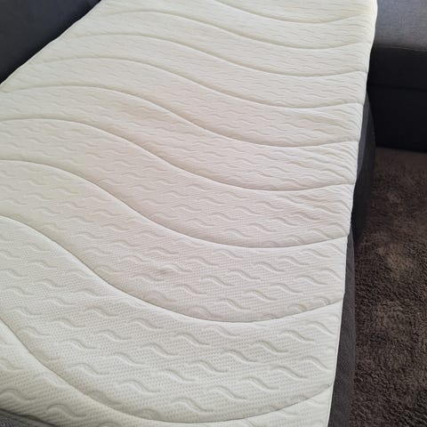 Jensen seng med overmadrass i mørk grå tekstil og lys overmadrass. Sengen står på ben i metall/tre-look og har rette, enkle linjer. Egner seg som dobbeltseng i soverom. Overmadrassen er avtagbar og ligger løst oppå sengens hovedmadrass. Passer for brukere som ønsker en klassisk, polstret seng fra Jensen med nøytral farge som kan kombineres med ulike typer sengetøy og interiør. Overmadrass nesten ny.