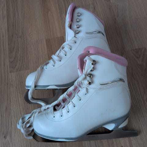 Kunstskøyter i hvit farge i barnestørrelse 37. Klassisk modell med høyt skaft og snøring foran for god støtte rundt ankel. Skøytene har fastmontert skøytestål med hæl og tåparti tilpasset kunstløp og annen skøytebruk. Egnet for barn som trenger stabile skøyter til lek og trening på is.