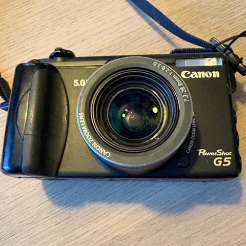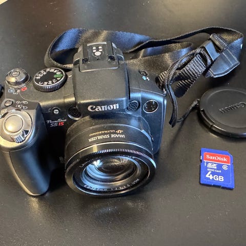 Canon PowerShot S5 IS digitalkamera i svart. Kameraet har innebygd zoomobjektiv og bildestabilisator (IS). Det har vridbar LCD-skjerm på baksiden og optisk søker. Kamerahuset har innebygd blits, programhjul på toppen og flere funksjonsknapper for manuelle og automatiske innstillinger. Batterirommet er plassert i grepet på høyre side. Leveres med objektivdeksel og kamerarem slik det vises på bildene.