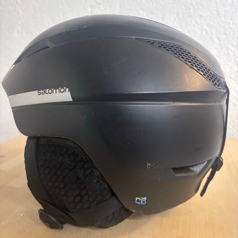 Salomon Prophet Custom Air skihjelm i størrelse M (55–59 cm). Hjelmen er svart med integrerte øreputer og justerbart Custom Air-passformsystem. Innvendig har den polstret og pustende fôr med mønster. Godkjent etter EN 1077:2007 Class B og ASTM F2040 standarder for alpinhjelmer. Egnet til bruk ved alpint og snowboard.