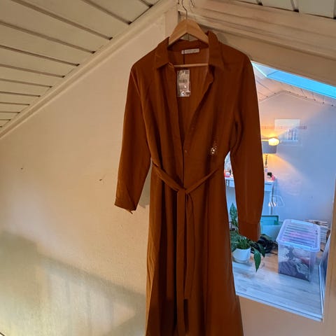 Mango hverdagskjole for dame i størrelse XL. Kjolen er flerfarget med blomstermønster og har omslagseffekt med knyting i midjen. Laget i polyester. Ermene er lange og stoffet er lett og faller mykt. Passer som hverdagskjole og til enkle anledninger.
