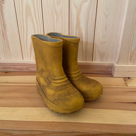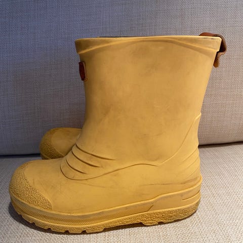 Gule, godt brukte, gummistøvler i størrelse 25 fra Kavat.