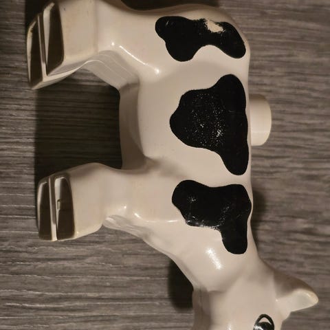 Design: Den har de karakteristiske svarte flekkene på hvit bakgrunn, store øyne og en rundere form enn vanlige LEGO-dyr.
