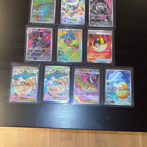 Pokémon pakke med blandede samlekort. Bildene viser et utvalg kort fra ulike serier og typer, inkludert hovedsaklig vanlige kort og noen holografiske/reverse holografiske kort. Antall og spesifikke utgaver fremgår av bildene.