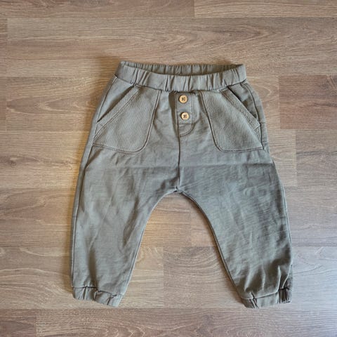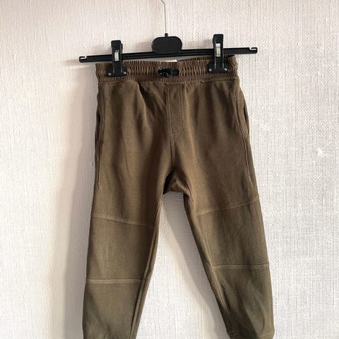 Newbie bukse for barn i størrelse 122, 7 år. Buksen er grønn og laget av bomull. Modellen har strikk i livet, knapper foran og lommer i siden. Bak finnes en lomme med liten merkeetikett. Unisex-modell som passer til hverdagsbruk for barn. Jeg har sydd litt på det ene kneet.