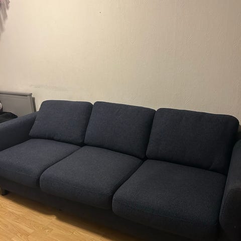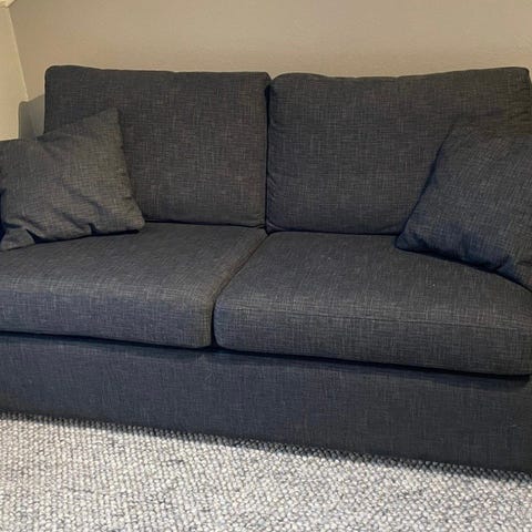 Grå/svart Ca 145cm bredde. Ullstoff i god kvalitet. God madrass, god å sove på. Enkel å slå opp