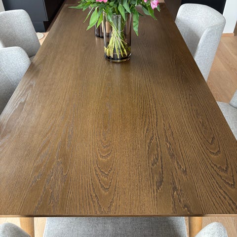 Pent brukt spisebord i heltre, (usikker på hva slags treverk). Bordet har en lysere flekk på platen (se bilde). Bordet ble kjøpt på Bohus for en del år siden. Ellers pent brukt, ingen hakk. Kan sikkert pusses og beises, så blir det som nytt.