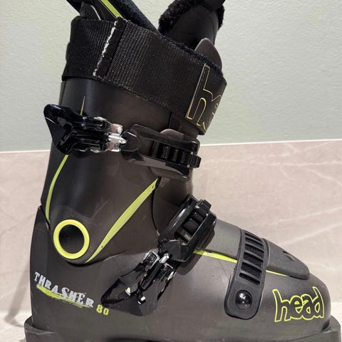 Head Trasher 80 alpinstøvler i størrelse 27–27,5 (mondo). Sorte støvler med grønne detaljer. Justerbar flex 70–80 gjør de godt egnet for alpint. Støvlene har fire spenner og powerstrap øverst for bedre tilpasning rundt leggen. Sålelengde er 270–275 mm. Passer til vanlige alpinbindinger.
