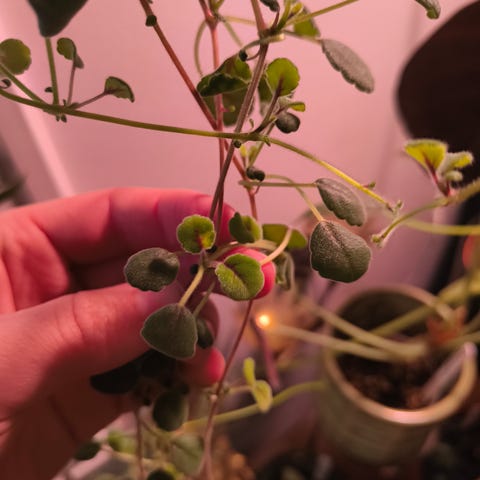 Selger stiklinger av nydelige Episcia sphalera. Planten har lodne grønne blader og nydelige hvite blomster (oppdaterer med bilder av blomstene neste gang planten blomstrer).