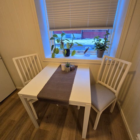 Uttrekkbart spisebord i hvit utførelse. Bordet har rektangulær bordplate som kan forlenges ved hjelp av uttrekksplater på begge sider. Ben i tre og metall gir et enkelt og funksjonelt uttrykk. Passer som spisebord eller arbeidsbord i kjøkken, stue eller mindre rom der det er behov for fleksibel bordplass.