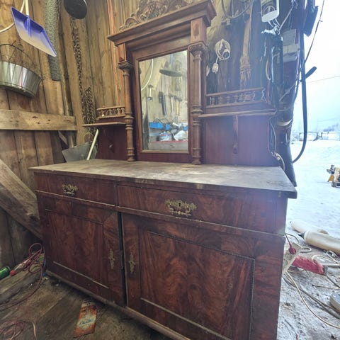 Skap håndlaget som del. Dører fra annet møbel. Trenger litt kjærlighet og maling, men kan passe til mye.