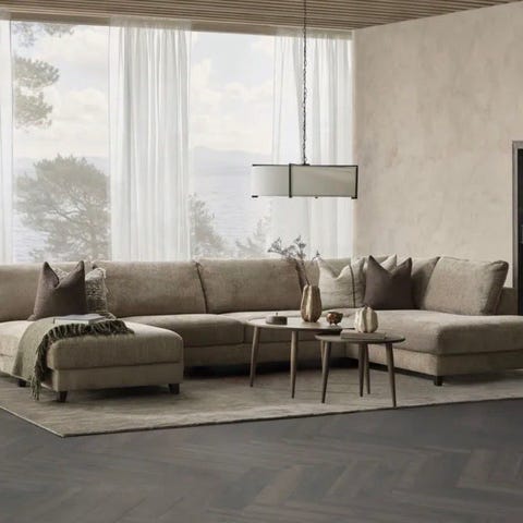 Sofaen består av flere moduler satt sammen til en hjørneløsning med venstrevendt og høyrevendt del. Den har løse rygg- og pynteputer som gir fleksibel støtte og kan omplasseres etter behov.
