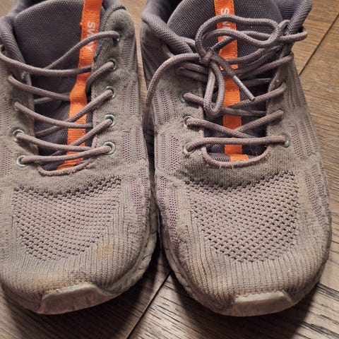 Sway løpesko i størrelse 42. Modellen er en lav løpesko med snøring. Skoene er i hovedsak grå med oransje detaljer på tunge og hælhempe. Overdelen ser ut til å være i pustende mesh-tekstil med forsterkninger rundt tå, sider og hæl. Yttersålen har mønster for grep og synlige dempeelementer i sålen. Egnet til løping og annen trening utendørs eller innendørs.
