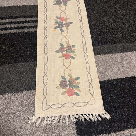 Tradition teppe med rektangulær form og dekorativt blomster- og rankemønster i flere farger på kremfarget bunn. Teppet har frynser i kortendene og passer for eksempel som lite gulvteppe, løper eller dekorativt innslag i gangen,