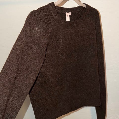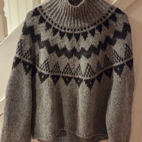 Nelly genser for dame i størrelse S. Genseren er laget i ull (+annet)og har brun hovedfarge med mønster rundt hals og overdel i lyse og mørke toner. Rund hals og lange ermer. Passer til hverdagsbruk og som varm lag-på-lag genser i kaldere vær.