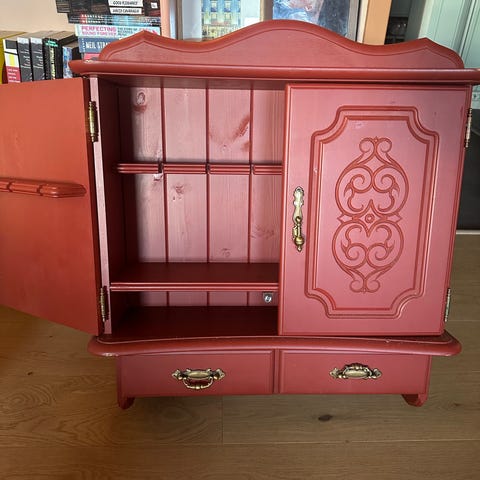 Pent hjørneskap i eik, med blyglassruter selges. Er 63,5 cm på det bredeste og inn mot hjørnet. 181 cm høyt.