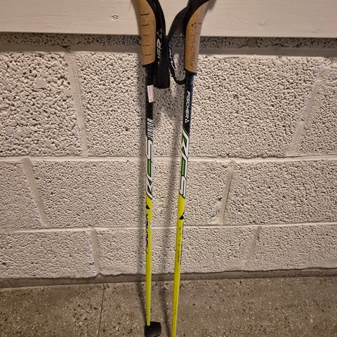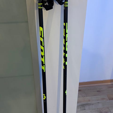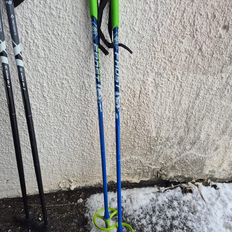 Skistaver i grønn farge. Staver med trinse nederst og håndtak øverst.