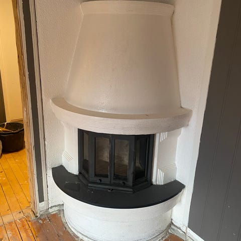 Peisinnsats med buet glassfront i hvit omramming. Innsatsen har doble dører med glass som kan åpnes til sidene, og brennkammeret er kledd med lys innvendig plate.