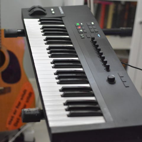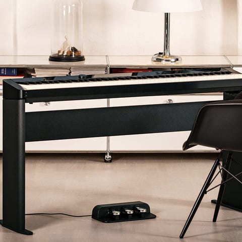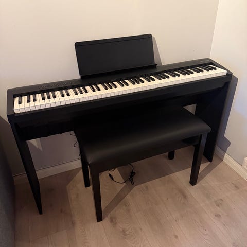 Yamaha P-45 digitalpiano med 88 fullt vektede tangenter i svart utførelse. Instrumentet har innebygd notestativ og sustainpedal, samt strømforsyning. Egnet til øving hjemme, undervisning eller som kompakt løsning der det er behov for et digitalt piano med standard klaviaturstørrelse. Følger med stativ og krakk som vist på bilder.
