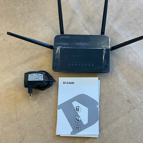 Asus RT-AC86U router i svart. Trådløs ruter med tre eksterne antenner og flere statuslamper på fronten. Enheten har tilkobling for strømadapter (medfølgende på bildet) samt nettverksporter på baksiden. Egnet som sentral enhet i et hjemmenettverk for kablede og trådløse enheter.