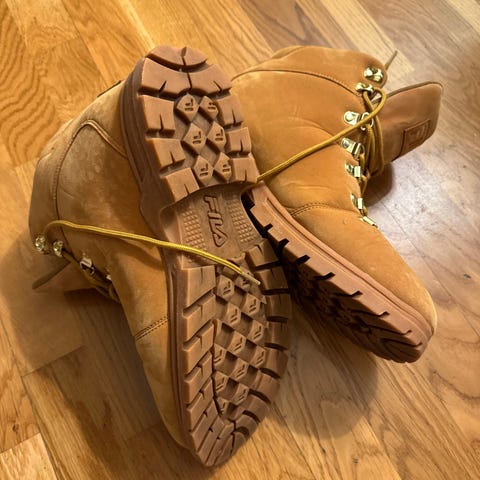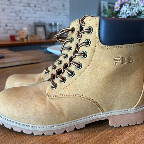 Fila støvler i størrelse 42. Støvlene er i en brun/tan farge med snøring foran og kraftig, mønstret yttersåle. Overdelen har en semsket/matt finish med polstret ankelparti i mørkere kontrastfarge. Egner seg som hverdagssko og til bruk i kjøligere vær og på variert underlag.