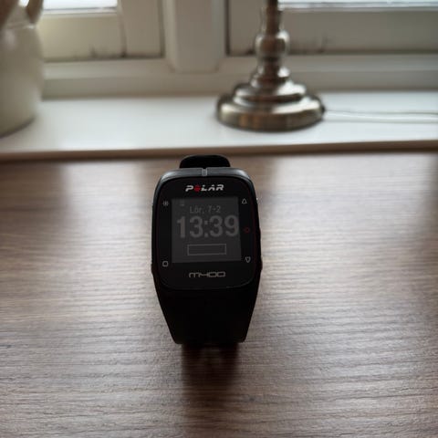 Polar M400 pulsklokke i svart. Klokken har rektangulær skjerm og gummirem med tradisjonell spenne. Modellen er egnet til trening og aktivitetssporing, og bæres som en unisex sportsklokke på håndleddet.