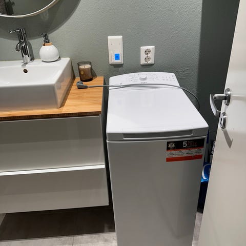 Vaskemaskinen er smal og toppmatet, noe som gjør at den passer perfekt på et lite bad.