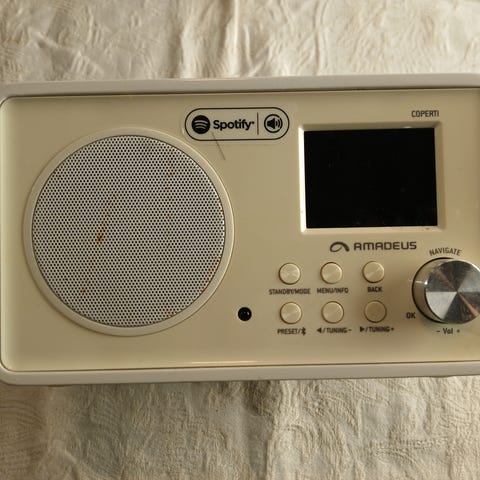 Amadeus bordradio med DAB+ og FM-mottak. Radioen har innebygd høyttaler i front, fargedisplay som viser kanal- og sporinformasjon, samt flere betjeningsknapper og volumhjul på frontpanelet. På baksiden finnes teleskopantenne, tilkobling for strøm og lydutganger.