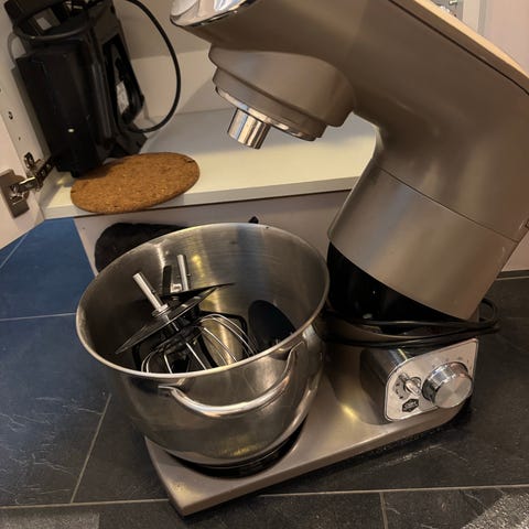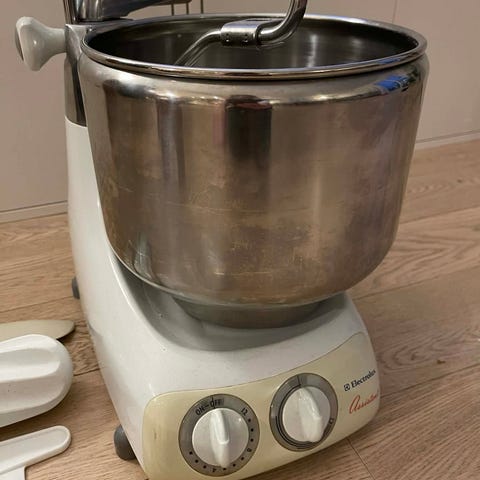 Kjøkkenmaskin med bolle i rustfritt stål. Inkludert visp og eltekrok. Fullt fungerende.