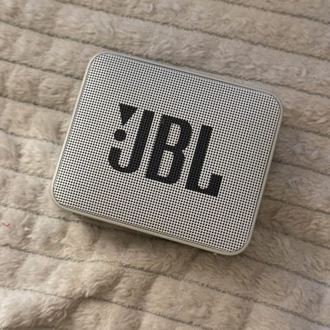 JBL Go bærbar Bluetooth-høyttaler i grå farge. Kompakt modell egnet for trådløs avspilling fra mobil, nettbrett eller andre enheter via Bluetooth. Høyttaleren har kontrollknapper på toppen for av/på, Bluetooth-tilkobling, volum og samtalefunksjon. På siden finnes innganger for lading via micro-USB og 3,5 mm AUX-inngang for kablet tilkobling. Praktisk bærestroppfeste på siden gjør den enkel å ta med seg. Egnet til bruk hjemme, på reise eller utendørs der det er behov for en liten, portabel høyttaler.
