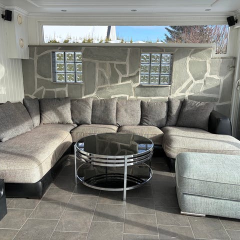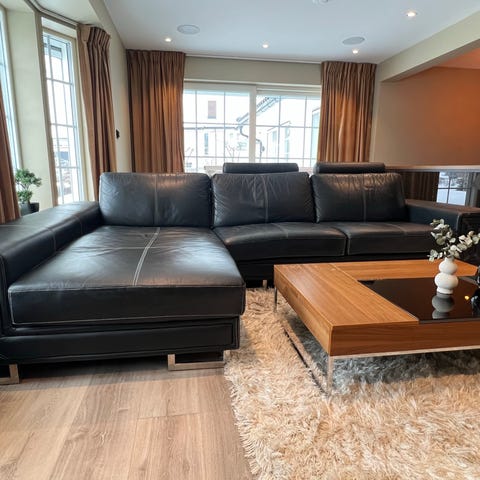 Pent brukt skinnsofa med puff. Utrolig god å sitte i, og har plass til mange.