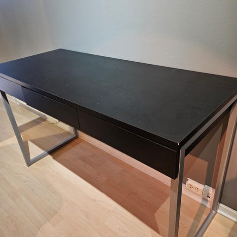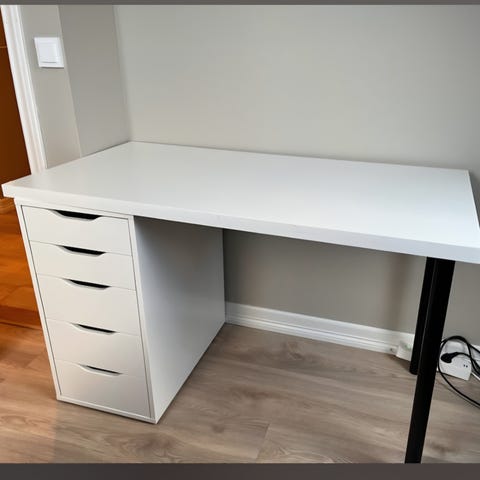 IKEA ALEX skuffeseksjon med plate (skrivebord). Skuffeseksjonen er svart. Platen er blå. Det er mulig å hente kun skuffeseksjonen dersom platen ikke trengs. Platen var festet til skuffeseksjonen, derfor bør den fortsatt brukes med platen på toppen (på grunn av festehullene). plate- 150x75cm