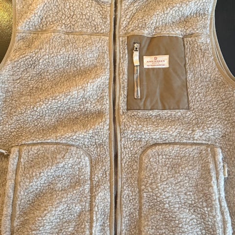 Amundsen vest for herre i størrelse L. Vest i brun ull med hel glidelås foran. Modellen har høy krage, to åpne frontlommer og en brystlomme med glidelås og logodetalj. Passer som mellomlag eller ytterplagg i kjøligere vær. Ingen bruksspor. Brukt et par ganger. Desverre litt for stor for meg. Nypris 2499,00kr