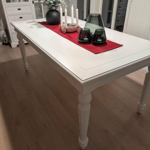 Spisebord med 8 stoler selges, 6 av stolene er helt fine, men 2 av stolene har noe malingsflekker på seg. Kjøper kan velge om de ønsker å ha med seg 6 eller 8 stoler
