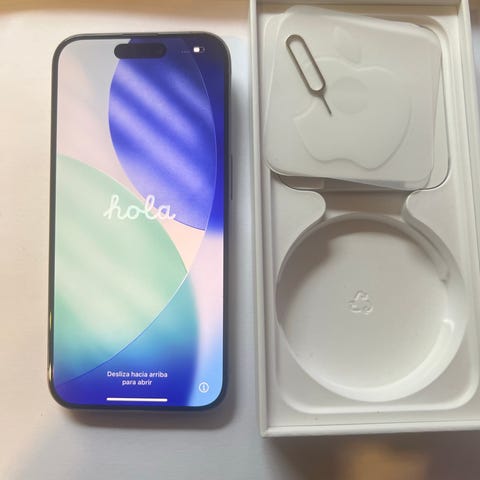 Telefonen har stor skjerm med frontkamera i skjermens øvre kant. Modellen leveres i original eske med USB‑C til Lightning‑kabel, dokumentasjon og SIM‑verktøy (hvis inkludert fra produsent). På bildene vises også deksel og skjermbeskyttere som kan følge med dersom selger ønsker det.