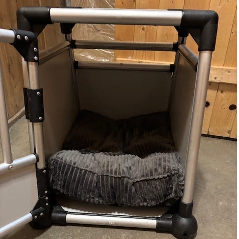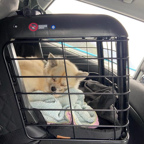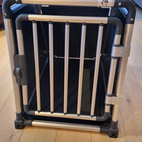 Hundebur for bruk i bil, laget i aluminium med grå sideplater og gitterdør i front. Buret har skrå bak- og frontside tilpasset bagasjerom i bil, samt solid ramme med stenger på toppen og sidene. Egnet for transport og sikring av hund i bil. Størrelsen passer typisk til mellomstor hund, avhengig av rase og mål. Buret har låsbar dør i front og ventilasjon gjennom gitterkonstruksjonen. Mål L-70cm bunn,topp 45cm.B-50cm bunn, topp45 cmH-65cm.