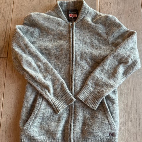 WoolLand ullcardigan for barn i størrelse 134-140. Cardiganen er i grå ull og har V-hals og knepping med knapper foran. Modellen har to lommer foran og ribbestrikkede kanter nederst og på ermene. På albuene er det blå stjernedetaljer, og nederst foran er det liten WL-logo. Unisex-modell som passer til hverdagsbruk og som mellomlag på kjølige dager.