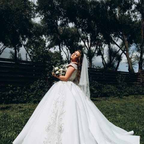 Skreddersydd og stilren brudekjole selges. Overdelen er korsett, noe som gjør at den kan tilpasses og passe størrelser fra M til XL.